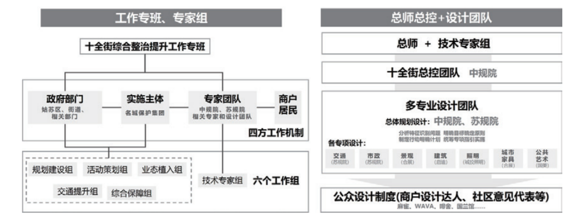 坚持“政府管基本、市场做提升”,形成政府引导、多元社会主体广泛参与的更新模式。建立四方统筹的工作组织机制,由市区两级政府部门、市属国企、专家团队联合成立十全街综合整治提升工作专班,联动商户居民、撬动社会资源投入街道发展,引导社会力量参与更新过程、维护更新成果,发挥政府引领、社会参与、自主更新协同效应。建立四级把控的设计管控制度,总师和技术专家组作为技术总把控、总控团队提供伴随式技术咨询,统筹协调多专业设计团队,引导商户设计达人、社区意见代表参与公众设计环节,形成“规划设计-工程施工-多元治理”全过程把控。